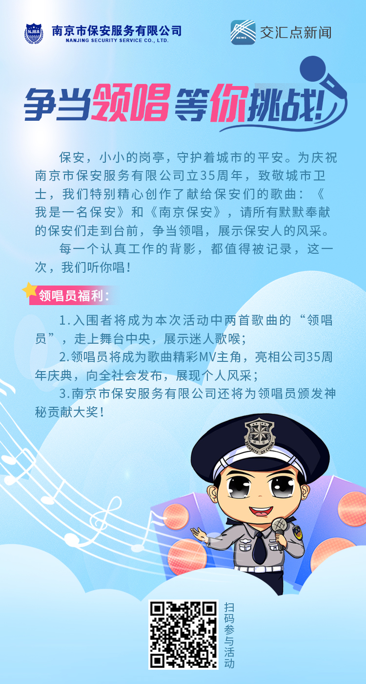 小小的崗?fù)?,大大的?zé)任,守衛(wèi)城市安寧,維護(hù)社會(huì)和諧。為致敬城市衛(wèi)士——保安,南京市保安服務(wù)有限公司聯(lián)手新華日?qǐng)?bào)·交匯點(diǎn)新聞,從5月8日開(kāi)始開(kāi)展“爭(zhēng)當(dāng)領(lǐng)唱”活動(dòng)。本次活動(dòng),南京市保傾力打造了兩首獻(xiàn)給保安的歌曲《我是一名保安》和《南京保安》,邀請(qǐng)所有保安走到臺(tái)前,唱出自己的歌,用歌聲抒發(fā)情感,用傳唱激發(fā)熱情。爭(zhēng)當(dāng)領(lǐng)唱,展現(xiàn)個(gè)人風(fēng)采的同時(shí),贏取“領(lǐng)唱員特別大獎(jiǎng)”!