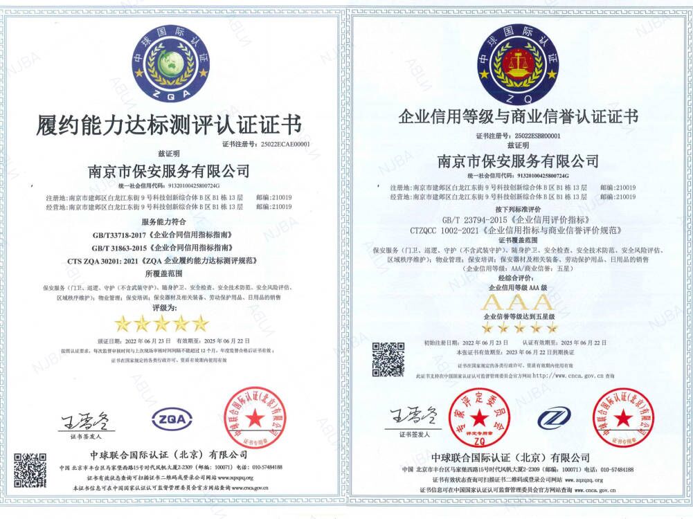 履職能力是企業(yè)安身立命的源動力,企業(yè)信用和商業(yè)信譽是企業(yè)發(fā)展的生命。經(jīng)過企業(yè)申報、企業(yè)自評、初評、專家現(xiàn)場評審,南京市保安服務(wù)有限公司順利通過履約能力達標測評、企業(yè)信用等級與商業(yè)信譽、碳中和三項認證,獲評履約能力五星級單位,企業(yè)信用3A級、企業(yè)信譽五星級單位和碳綜合達標單位。