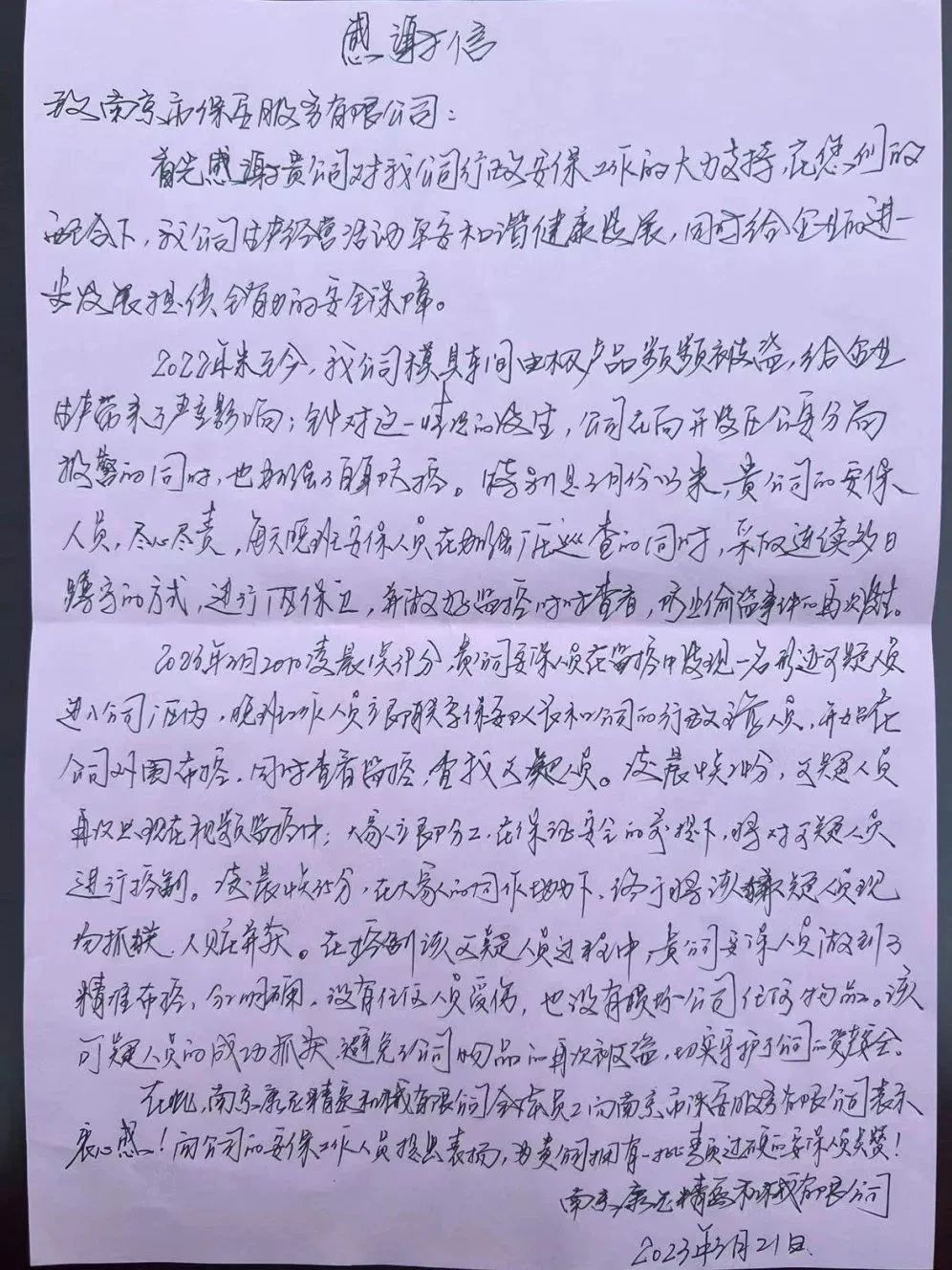 公司領(lǐng)導(dǎo)表示,保安員僅僅是做了分內(nèi)工作就得到康尼集團(tuán)如此高規(guī)格的表彰,我們深受鼓舞,感謝康尼集團(tuán)對(duì)我司的信任和支持,讓我們沒有理由不把本職工作做好。公司6名保安員從發(fā)現(xiàn)可疑目標(biāo)到精心布控再到奮不顧身勇擒竊賊,體現(xiàn)了南京市保人頑強(qiáng)的工作作風(fēng)。為鼓勵(lì)先進(jìn)、樹立典型,在全體員工中營(yíng)造堅(jiān)守初心、愛崗敬業(yè)、履職盡責(zé)的濃厚氛圍,公司將予以表彰獎(jiǎng)勵(lì)。希望全體員工能夠繼續(xù)秉承“服務(wù)無極限、安全到永遠(yuǎn)”的服務(wù)理念為保障客戶單位的平安做出自己的貢獻(xiàn)。